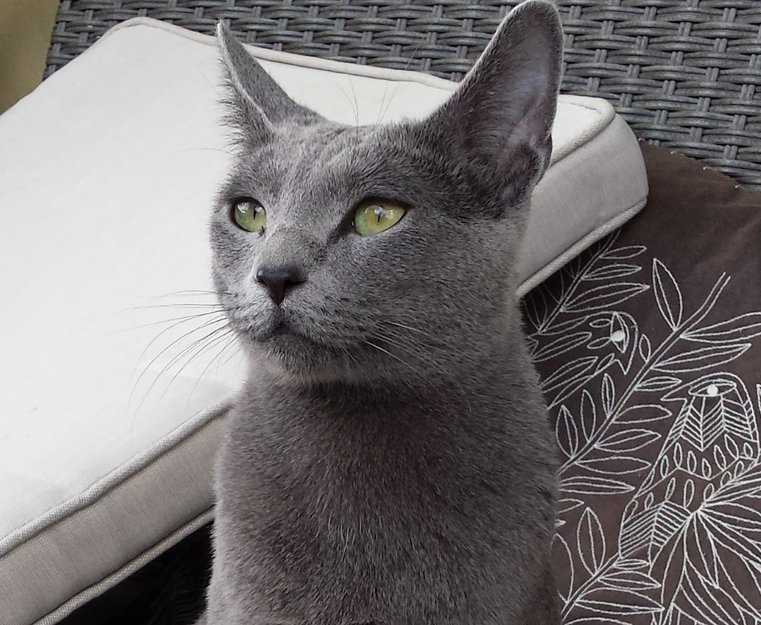 Ensfarget grå/blåskimret. Har chip. Grønne øyne, tillitsfull.