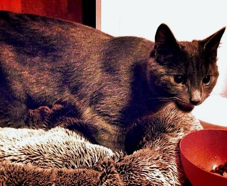 Liten, tynn, ung, hannkatt, ukastrert, koksgrå/ sort/sølvfarget, mørke øyne, ekstra tommel på potene,