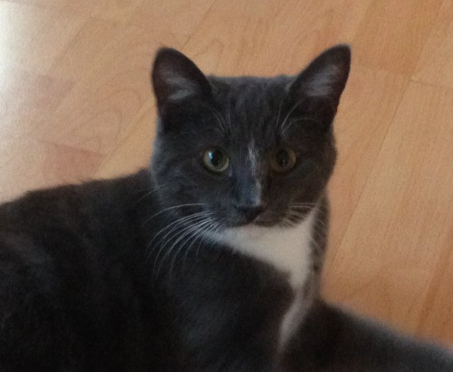Liten grå hunnkatt med hvit på nesa, på brystet og potene.