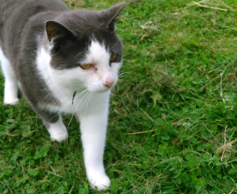 Katten er grå på øverste del av kroppen, ører,venstre øye, hode, rygg ,hale sidene og nesten hele den høyre /fremre bakfoten. Med unntak av litt hvitt bak i nakken.