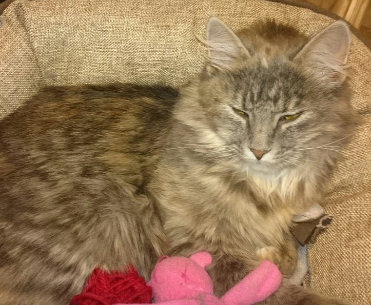 Ho kattunge på 8-9 mnd'er , ikke sky, tillitsfull, kjælen, maler mye.. ho har også litt brun farge i sin gråspraglete pels.