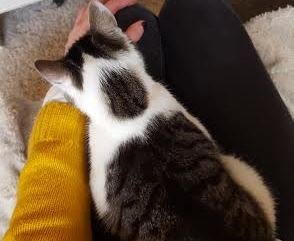 Liten kattunge gikk på nardosenteret. Tok den med meg hjem (bor 100 meter unna) da jeg var redd for at den skulle havne ute i veien... Veldig sulten og tørst. Veldig tillitsfull og nysgjerrig. Hvit på deler av nakken og magen, mørke tigerstriper på rygg.