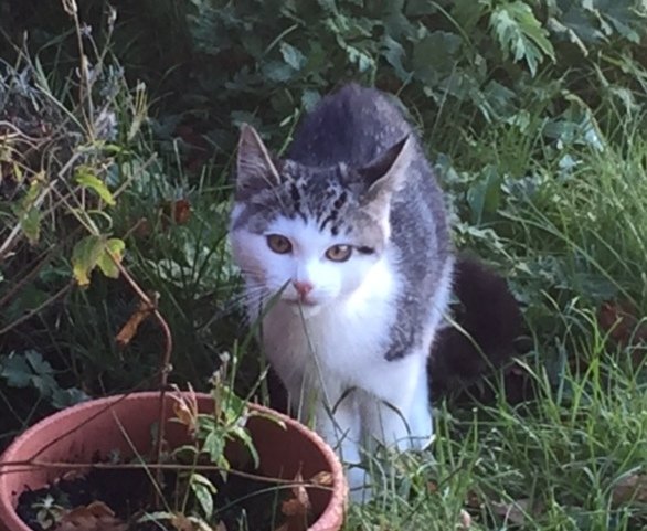 4,5 måneder gammel hvit, svart og grå kattunge forsvant fra hagen sin ca 20:00 på Halloween. Han er nysgjerrig og omgjengelig og kan ha fulgt etter barn som gikk trick or treat. Han har ikke forlatt hagen før, så vil antageligvis ikke finne veien hjem på egenhånd.