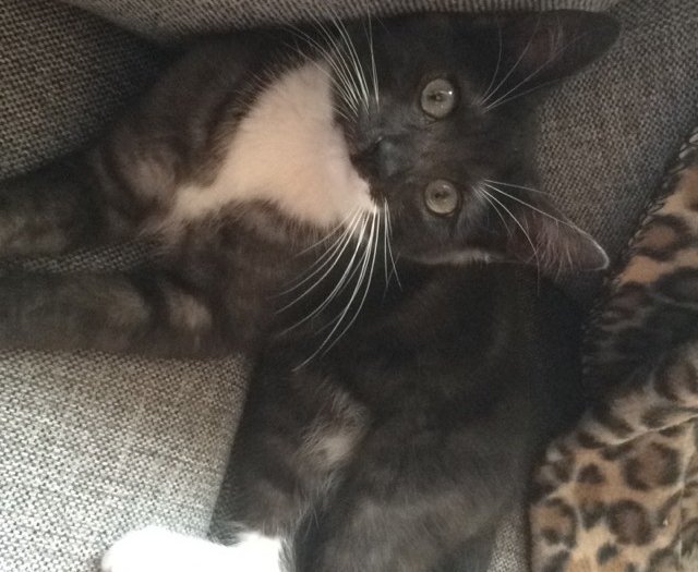 Pus er ca 5 måneder gammel. Han er grå- og svartspraglete med hvite poter og hvit mage.