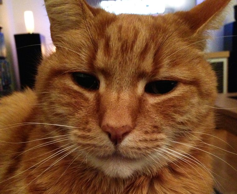 Oransjestripet kastrert hannkatt med øremerke. 13 år gammel og veier rundt 4 kg.