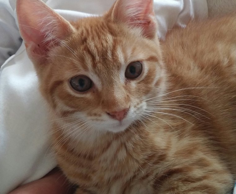 Han er oransjestripet med litt hvitt under haken. Lang, tynn hale. Han er veldig sosial og går gjerne inn i fremmede hus.