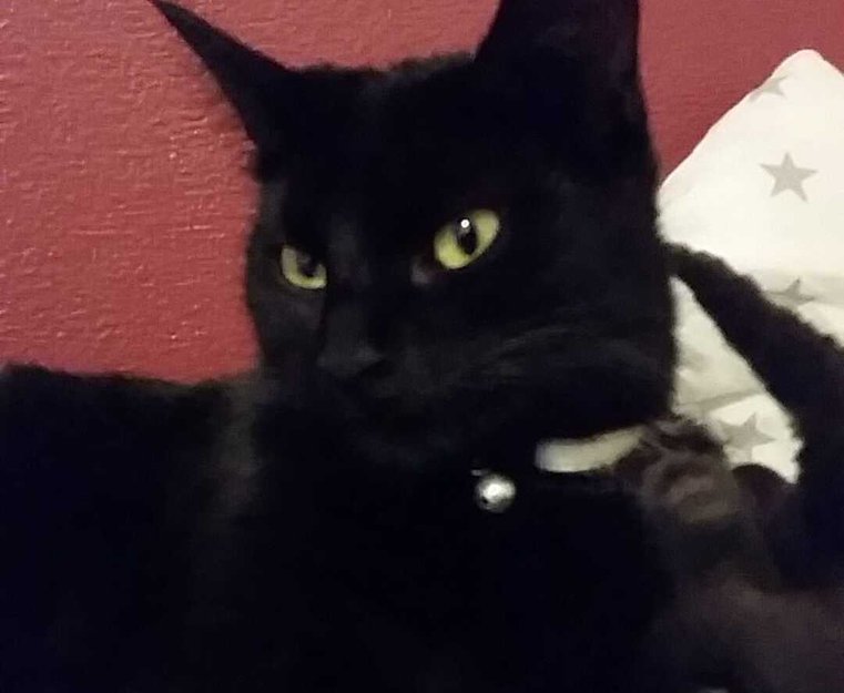 Hun har helt svart blank pels med liten hvit flekk på mage og bryst. Vis hun ikke har mista halsbåndet sitt så er det rødt med refleks og nr mitt. Hun er 1,5år.