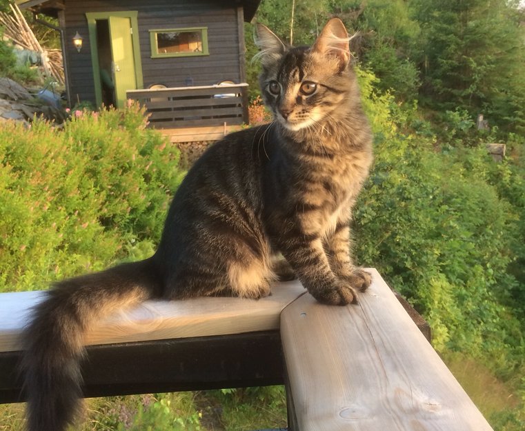 Tigergutt er en stor tigerstripet kastrert hannkatt på 8 måneder. Han har stor buskete hale og duskete i ører. Han er mørk over ryggpartiet og på labbene, under er han svart og brunstripete. Pelsen er silkemyk og relativt langhåret. Han er kjælen og kosete og liker å leke der det er barn.