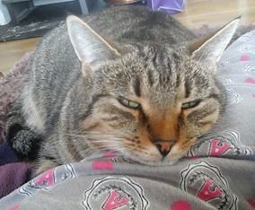 Er grå/brun/sort spraglete (tabby) med en viss karamellfarge. Mjauer vedlig lavt og er sky overfor fremmede.