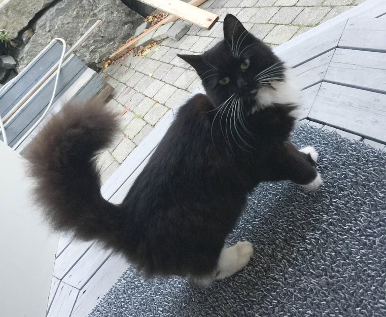 Vi har de siste dagene hatt en svart og hvit katt sittende utenfor huset, vi er usikker på om den er gått seg bort eller ei, men den ser ikke ut til å forsvinne og virker veldig sulten. Det er ingen halsbånd på den.