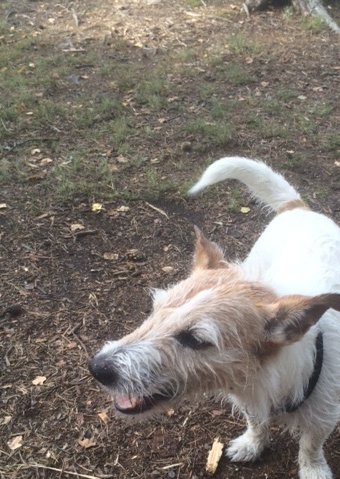 Jack Russel tispe på ca 8 år. Grå stær på venstre øye. Markant brun flekk bakre høyre del.