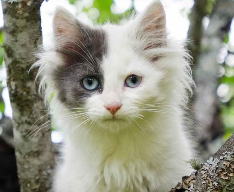 Flott hvit og grå hannkatt med blå øyne. Han har et spesielt ansikt delt i to farger, grått og hvitt med knallblå øyne. 50 % Maine Coone og derfor stor for alderen, hos veterinær for en uke siden veide han 2,7 kg. Flott ganske lang pels. Snakker mye