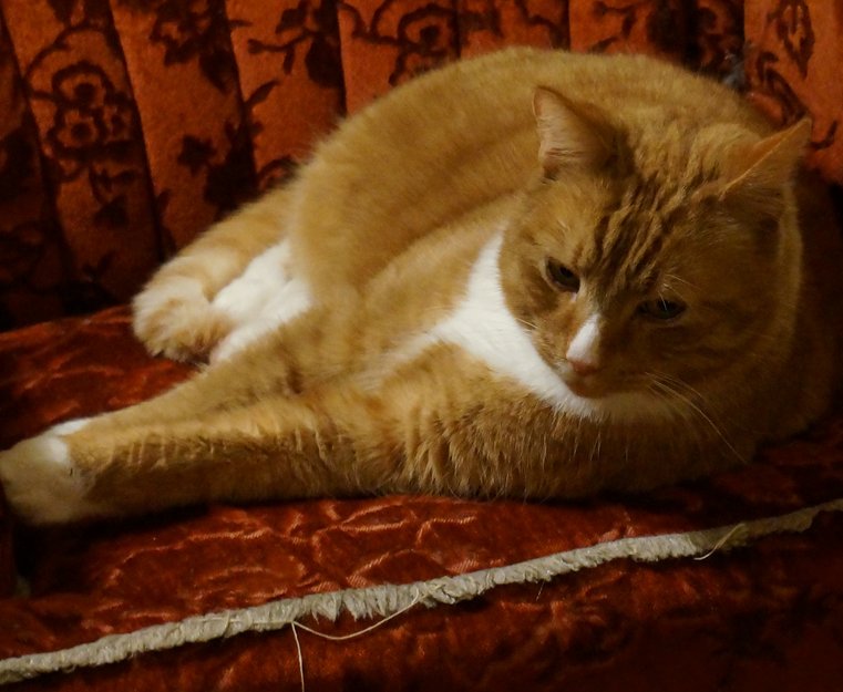 8 år gammel oransje hannkatt i godt hold. Kosete og menneskekjær, men sannsynligvis redd nå. Har på seg rosa bånd. Bruker vanligvis aldri bånd, men hadde på seg dette for ikke å stikke av da vi skulle til dyrlegen. Han har blitt barbert av dyrlegen på begge fremben grunnet bittskader.