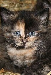 kattungen har sjakkmønstret ansikt, med orange, sort og hvit. resten av kroppen er blandet med brun, orange og sort. Halen er helt sort, med hvit haletupp.