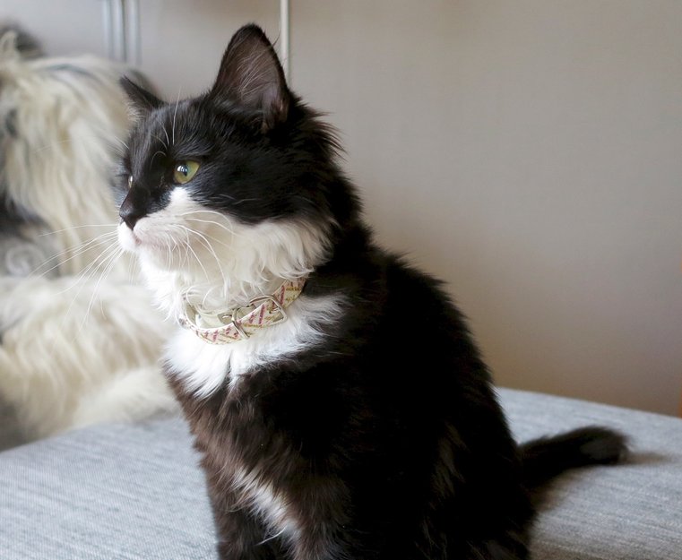 Sort og hvit semi-langhåret hunkatt på ca 6 måneder, med grønne øyne. Den siste delen av halen har en knekk.