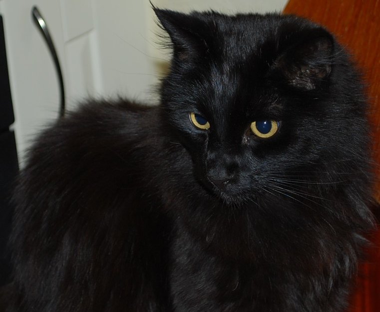 Svart langhåret, lang og slank hannkatt. Ekstra lang hale, store poter(skipskatt).