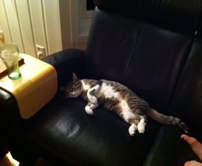 Gråstripet med hvit mave og bryst. Chip i nakken, tatovert i øret. Liten hunnkatt. 1,5 år gammel.