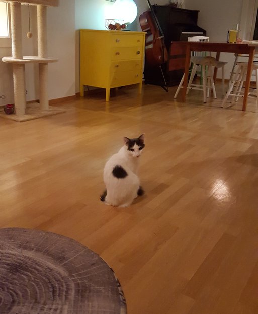 Nydelig hvit katt. Grå hale og grå flekk på siden. Id-merket i øret. Grått på hodet og ører, ser litt ut som han har midtskill. :-) Halvlang/lang pels. Halvt skogskatt. Svart halsbånd. Han er sosial og nysgjerrig. Sett han har prøvd å gå inn til naboblokkene.