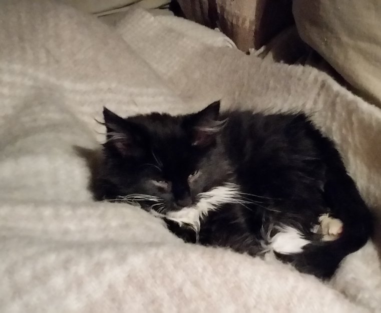 Liten sort/hvit kattunge dukket opp på min gårdsplass i går kveld. Den kan være 2-3 mnd og er meget tillitsfull, tydelig vant til folk.
