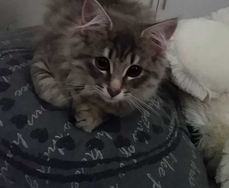 Hun er grå med lys og mørk gråfarge ,har også ein tredje farge , ser ut som hun har tigerstriper. Hun er 7 mnd gammel . Rosa /lilla halsbånd med adrs og telefon nr .