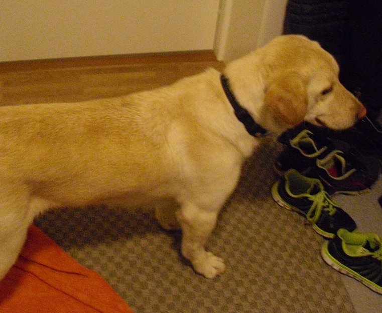 Ligner litt labrador, rolig hund, har halsbånd på.
