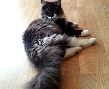 2,5 år gammel norsk skogkatt. Ca 5 kg, slank og lang. Grønn/gule øyner, lang og bustete hale og lett gjenkjennelig svart og hvit snute. Mjauer lite.