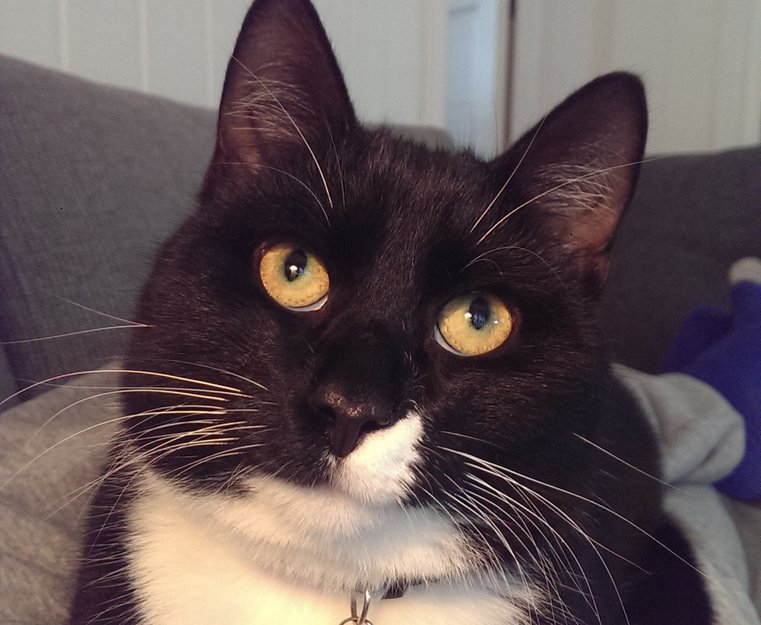 Sort med hvite poter og hvit på brystet. Veier ca 4,5 kg. Mjauer nesten ikke..