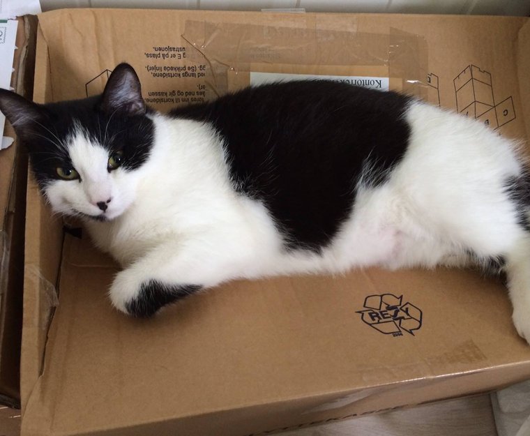 Svart og hvit korthåret pels. Svarte poter og svart flekk på snuten. Gulaktige øyne. Det er et svart mønster som går over begge øynene til katta, og under deler av haka er det svart pels. Helt svart hale. Katta er litt over ett år gammel og stor av størrelse (men ikke tjukk).