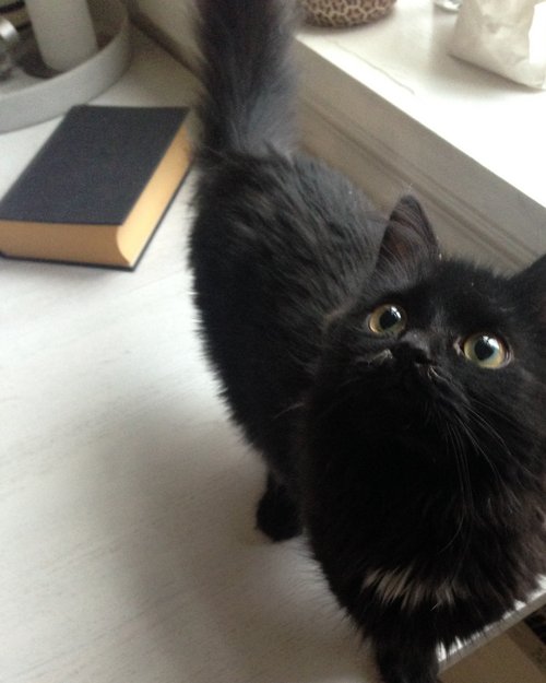 Mia er en liten langhåret hunkatt. Hun har svart pels med litt hvitt på brystet. Gule øyne. Uredd, leken og tillitsfull.