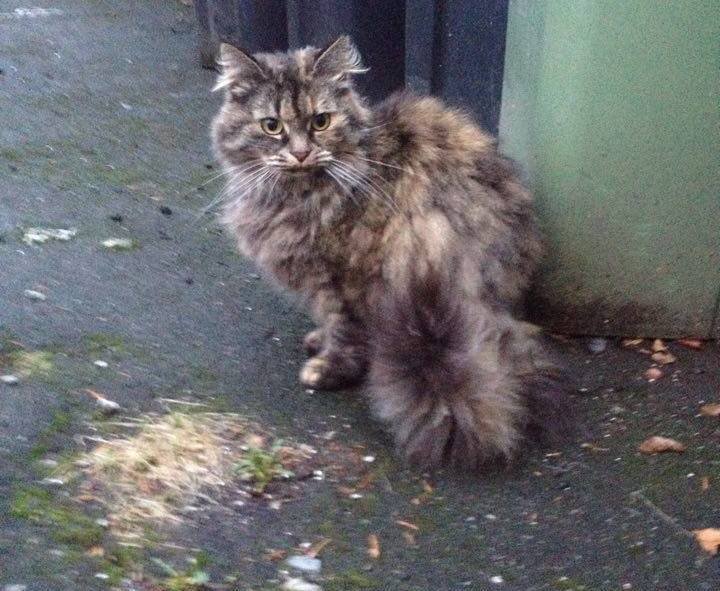 Har sett denne katten drive rundt i gatene med dårlig pels og var veldig sky. Så denne katten i flere måneder, så la jeg merke til at den hadde en svær floke i pelsen, snakket med dyrebeskyttelsen, de ba meg prøve å klippe den vekk. Men når jeg skulle prøve å fange og klippe den forsvant den. Har ikke sett den på flere uke, så dukket den opp her på lørdag den 28 November , da fikk jeg fanget den. Denne katten er helt nydelig, langhåret og spraglete i pelsen. Har ikke peiling på hva rase, men tror det er en jente. Den har ikke chip, men er ikke vill så tror noen eier den eller at den har blitt forlatt. Det virker som om hun har vondt i magen.