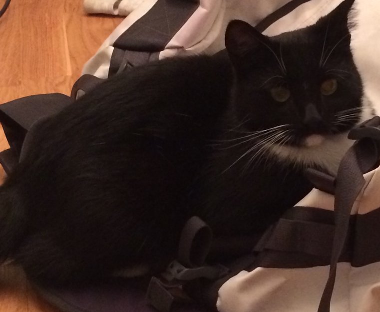 Katten er svart og hvit. Potene og magen er hvit. Den går på en litt rar måte da bakfotene ikke kan bøye seg like bra pga. medfødt kneskade.