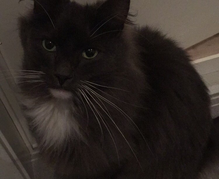 Hel grå stor hann katt med hvitt bryst.. Noe hvitt på poter. Veldig gla i mat og ekstremt kosen. 4,3 kilo!