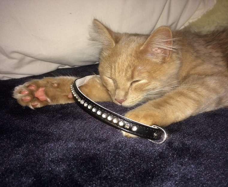Ser ut som er en ungkatt. Veldig kjælen og snill. Ser ut til å være vant med hunder. Har halsband. Uredd.