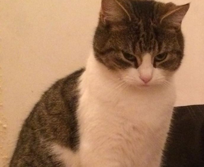Hvit og gråfarget hunnkatt sist sett i Fageråsen mandag 7. desember 2015. Hun er sterilisert og holder seg stort sett i området Wergeland - Sletten - Fageråsen.