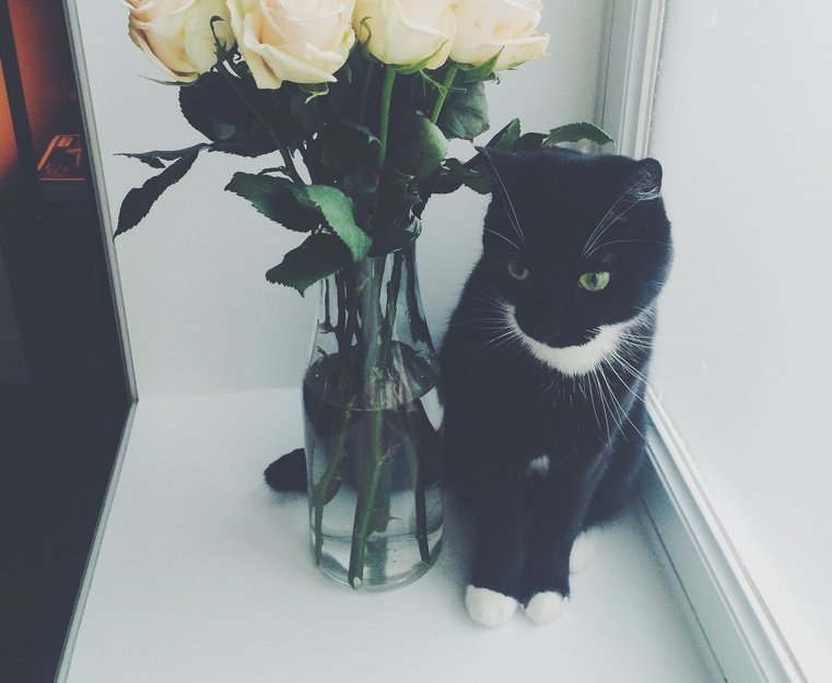 Sort, myk pels med hvitt under hals, på mage og potene. Liten og slank til å være fullvoksen. Innekatt som har rømt, og er derfor trolig veldig skremt og redd. Lys, fin mjauing.