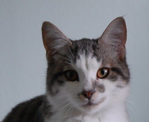 Hankatt, tigerstripet grå rygg, en del hvit foran. Veldig folkekjær og kontaktsøkende.