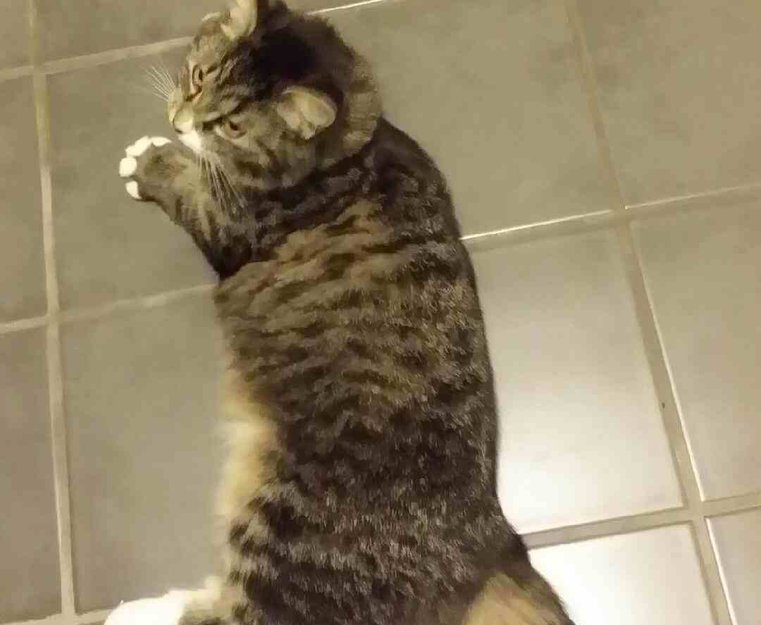 Stripete mørk katt, med liten hvit flekk i ansiktet, hvite poter og hvit mage. Veldig kontaktsøkende.