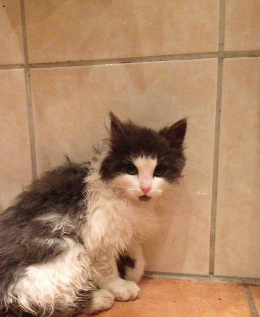 Katten, som er altfor liten til å være ute, mjauet kjempehøyt utenfor kjøkkenvinduet. Jeg gikk etter og fikk den inn. Hun er veldig skvetten, liten og redd. Har nok gått ute i noen dager, pelsen ser forferdelig ut og hun er veldig skitten. Er i kontakt med Dyrenes Beskytter Aust-Agder om henne.