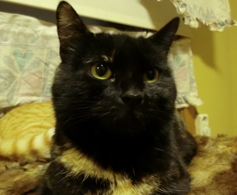 Hun har svart pels md noe lysebrunt innimellom. Hun har en lysebrun stripe tvers over brystet, og nedover venstre bakfot har hun også en del lysebrun pels. Men hun er en mørk katt.