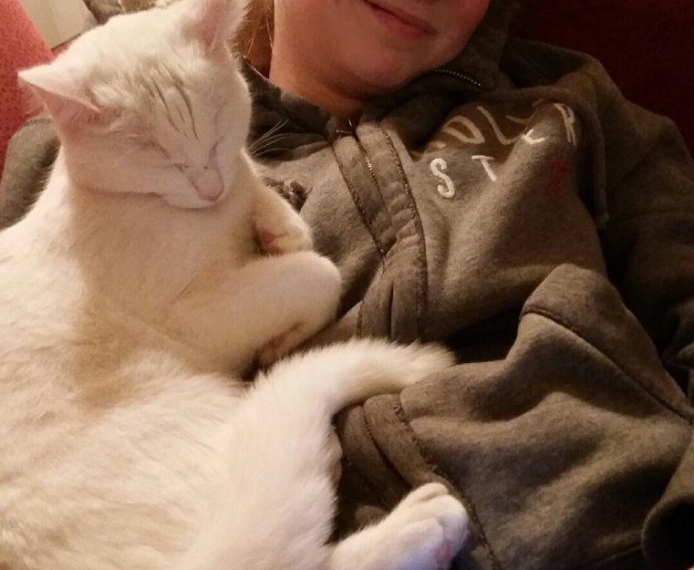 Liten, hvit og slank hunnkatt. Er sosial, og kommer bort til de som lokker på henne. Jamrer en del, og har stått utenfor andres hus og villet inn før.