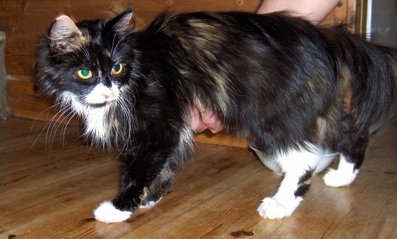 En ung hukatt,kroppen er sort med litt brunt i,hvite poter og hvit mage og nese.Veldig kjælen og tillitsfull.