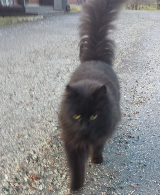Katten har gått en stund i området vårt og har villet inn. Da vi ikke så noen som tok seg av den slapp vi henne inn og ga henne mat. Hun var veldig tynn med tovete pels. Nå har hun vært hos oss i ca 2 uker. Sover veldig mye og er ekstremt kosete. Snakker lite.