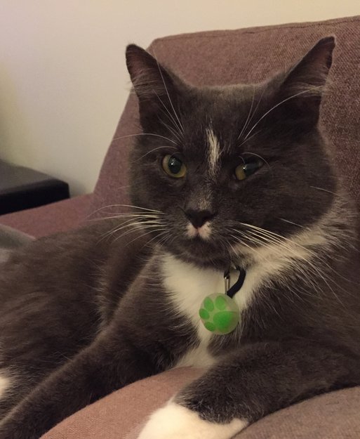 Grå skipskatt, med hvite poter, mage og snute. Også en hvit lang strek på underside hals opp til munn. Katten er chippet.