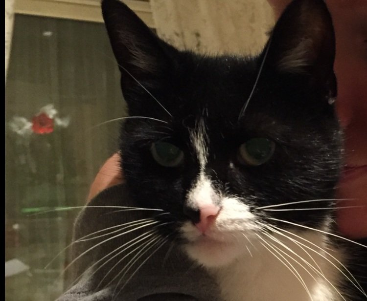 Sort og hvit hunnkatt med sort prikk på halve snuten. Tynn og liten med litt "sløve" øyne. Kosete og rolig lynne. Fremstår som innekatt. Renslig.