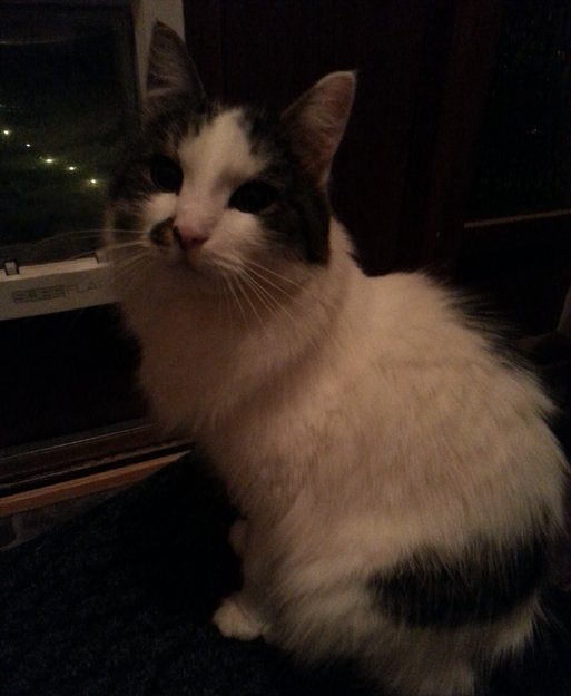 ID merket. Kontaktsøkende. Lang busket hale. Mest hvit, noen flekker over rygg, mørk hale. Liten flekk ved snuten.