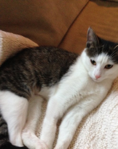 Katten er hvit på magen og fjeset, ryggen er gråstripet.