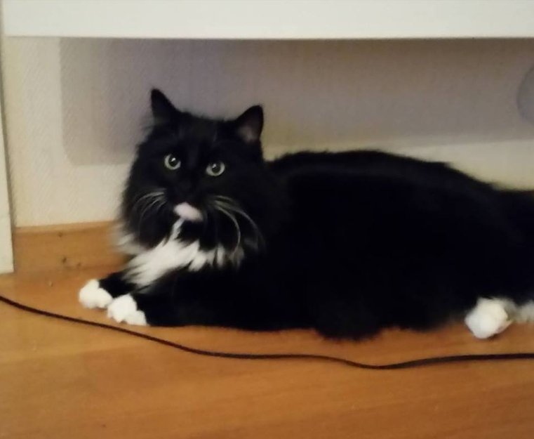 Han er sort med hvite strømper bak og hvitt på forpotene. Hvit hake og hvit på brystet. Han er kastrert og chippet.