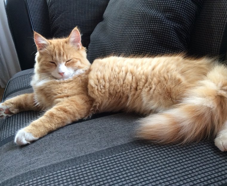 Simba liker å være ute. Har katteluke, så han gikk ut og inn som han ville. Han fulgte datteren vår til byen et par ganger, men klare å ta seg hjem selv. Han er bare 8 mnd, men er ganske stor. Veldig flott buskete hale på pus. Han har "løvemanke" og helt hvit fta nesen og under haken. Han er øremerket og chipet. Veldig "pratsom", snill og tillitsfull. Leken og nysgjerrig