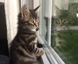 På bilde er den 3 måneder, nå er den 8 måneder. Kan se ut som en "voksen" katt. Han har ikke veldig lang pels, men heller ikke kort. Veldig lodden/myk, og veldig kosete. Pen i tegningen. Har to svarte prikker på hver side av munnen.