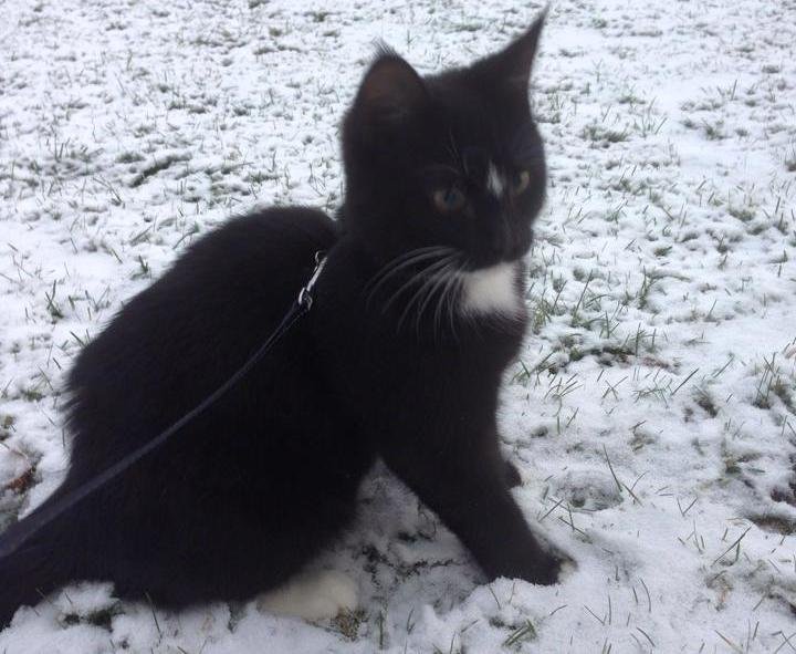 Pus er øremerket og kastrert. Hvit flekk under haka.
